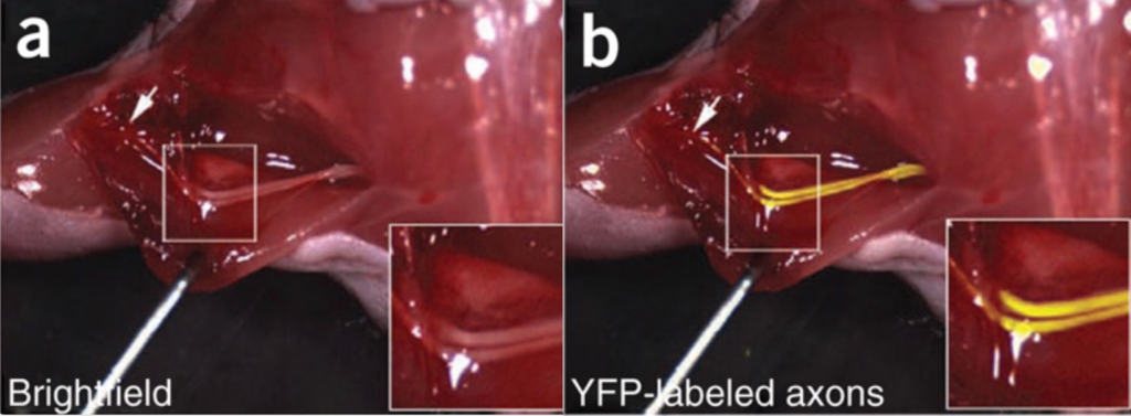 This technology uses the building blocks of proteins, called peptides, that are labeled with fluorescein, a dye that appears bright under specific lighting. This composite of peptide + fluorescein then binds to nerves after being injected intravenously and is subsequently imaged using a microscope. Several of these are in various stages of clinical development 7. Favorable attributes to this approach are high contrast within the nerve, real-time capability to protect nerves, and 3D rendering. Preliminary disadvantages include the need to make an incision to use the technology, need for proprietary microscope, limited depth of visualization.
