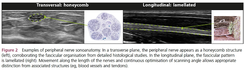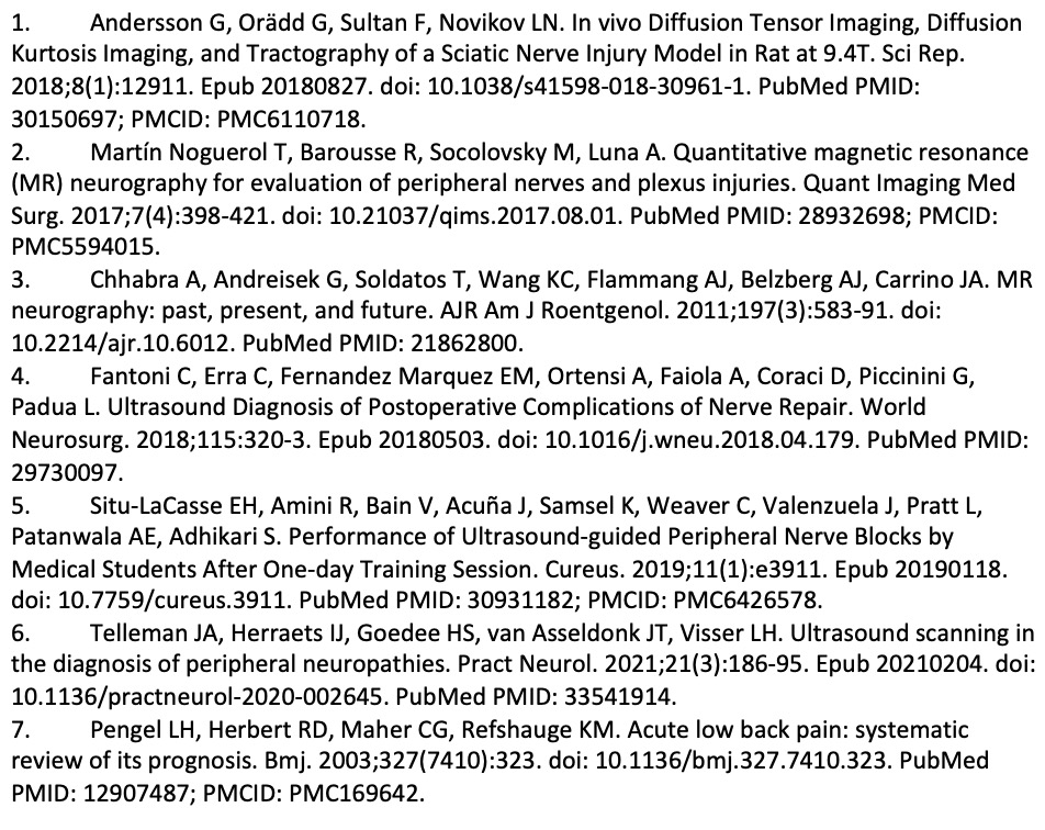Ultrasound is also considered one of the safest forms of internal imaging because it does not use electromagnetic radiation or ionizing radiation (e.g., x-ray). As with other imaging modalities, a detailed knowledge of anatomical landmarks is necessary for this technique and therefore demonstrates user variation. Ultrasound can be used to identify and localize alterations in nerve continuity. Therefore, it can be useful in estimating nerve injury in a granular manner, as a visual guide for invasive procedures and intra-operative exploration, and to diagnose postoperative nerve repair complications4 such as neuromas. In addition, because it is real-time, ultrasound is used to provide visual guidance for delicate tasks such as injections (e.g., steroid) around nerves5